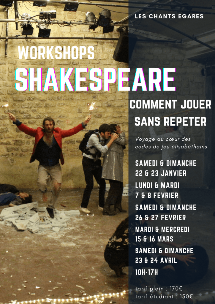 Chaque workshop mettra l’accent sur quelques aspects spécifiques du jeu élisabéthain, en fonction des scènes des participants. Il est donc judicieux de suivre plusieurs workshop pour compléter ou approfondir ces outils.